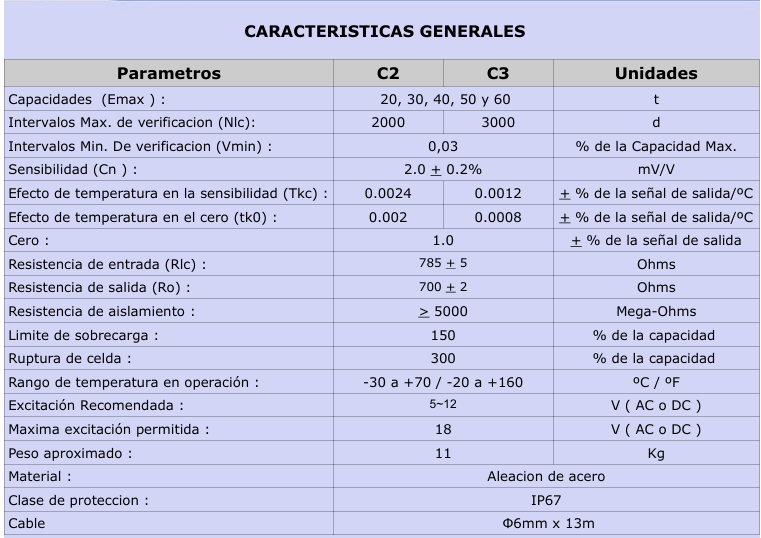 Celda de carga tipo botella con platinas de montaje, fácil instalación, utilizada en basculas camioneras, tanques tolvas silos. Clase C3, sensibilidad 2mV/V, fabricada en aleación de acero. Impedancias características 775 ohm entrada y 701 ohm salida. Capacidades disponibles: 20.000 kg, 30.000kg, 40.000kg.